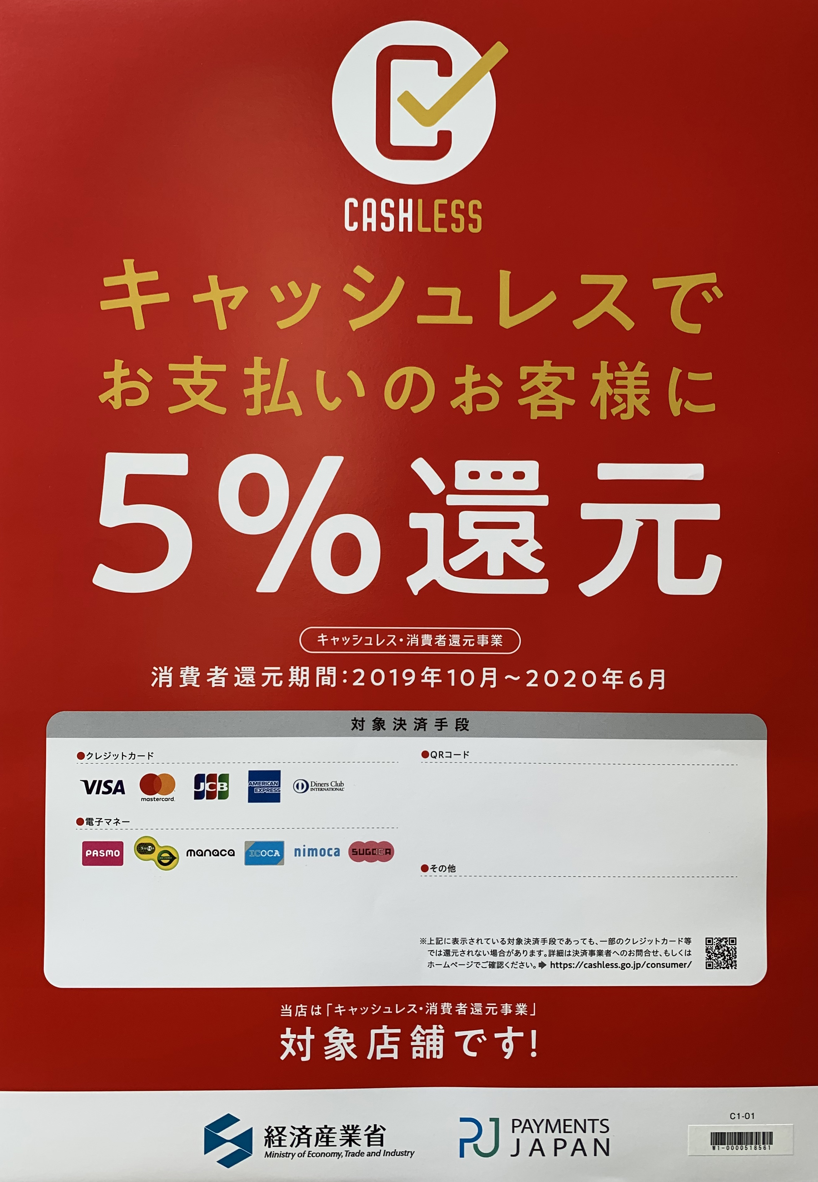 当店はキャッシュレス・消費者還元事業の対象店舗です。2019年10月〜2020年6月までの間キャッシュレス決済でお支払い頂いた方には後日5%ポイント還元されます!