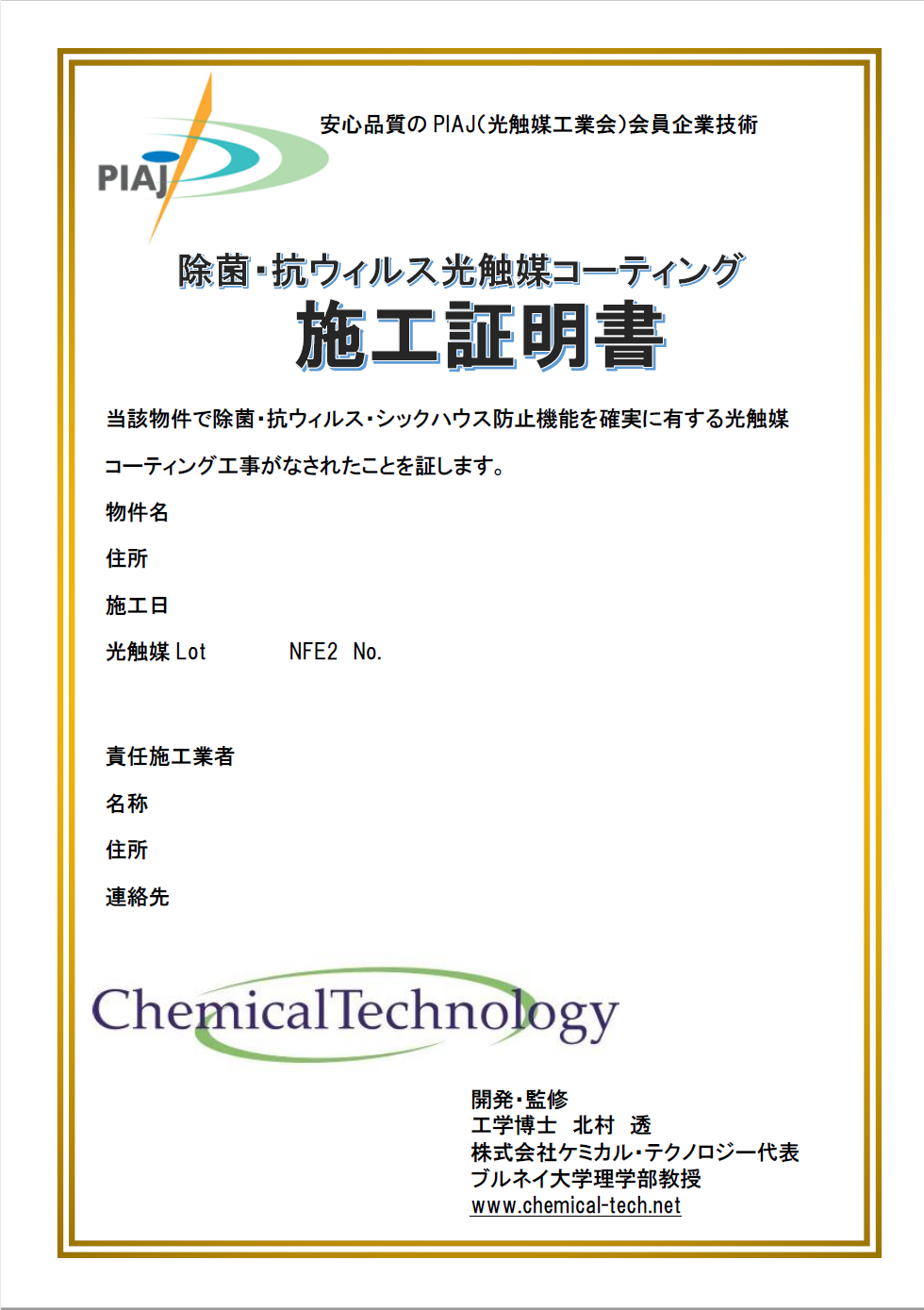 光触媒コーティング液「NFE2」開発の株式会社ケミカルテクノロジー北村博士とダブルで証明します。